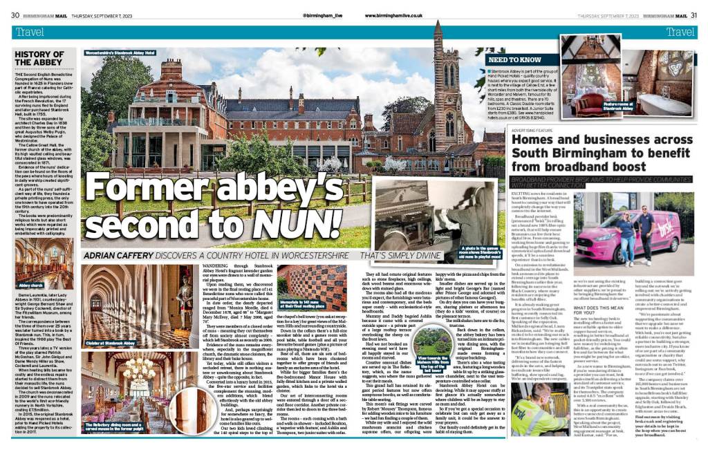 Stanbrook Abbey is part of the group of Hand Picked Hotels – quality country houses where you expect good service. It is next to the village of Callow End, a few short miles from both the riverside city of Worcester and Malvern, famous for its hills, spas and theatres. There are 70 bedrooms. A Classic Double room starts from £230 inc. breakfast. A Junior Suite starts from £380 and a Superior Suite (a slightly larger room) starts from £430. See www.handpickedhotels.co.uk or call 01905 832940.